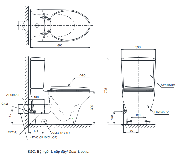 Tâm xả : 180mm (P-trap type)