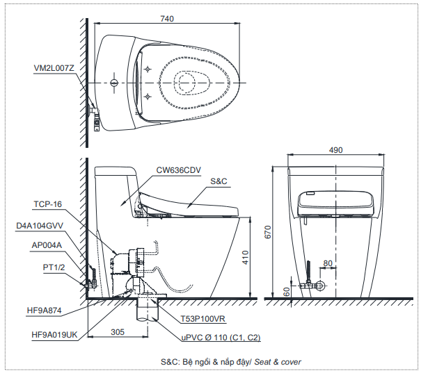 Tag: bàn cầu một khối, MS636CDW10, Nắp rửa điện tử