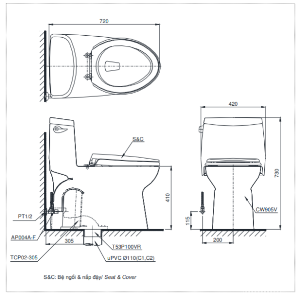 - Thiết kế bàn cầu thân kín, vành kín tiện dụng cho việc vệ sinh hàng ngày
